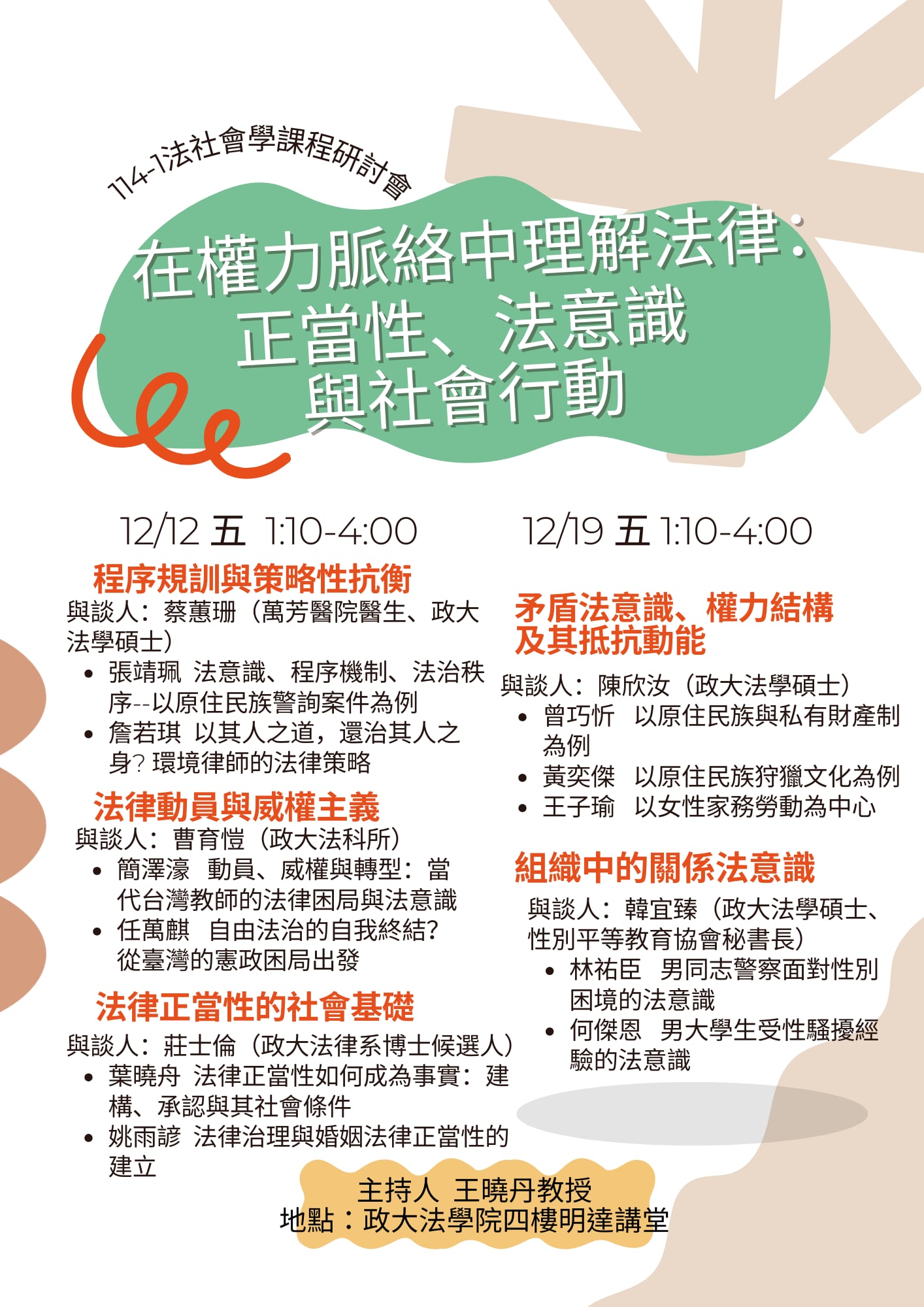此活動為「法社會學專題研究課程」學生期末發表研討會,無需事先報名,歡迎自由參加!
